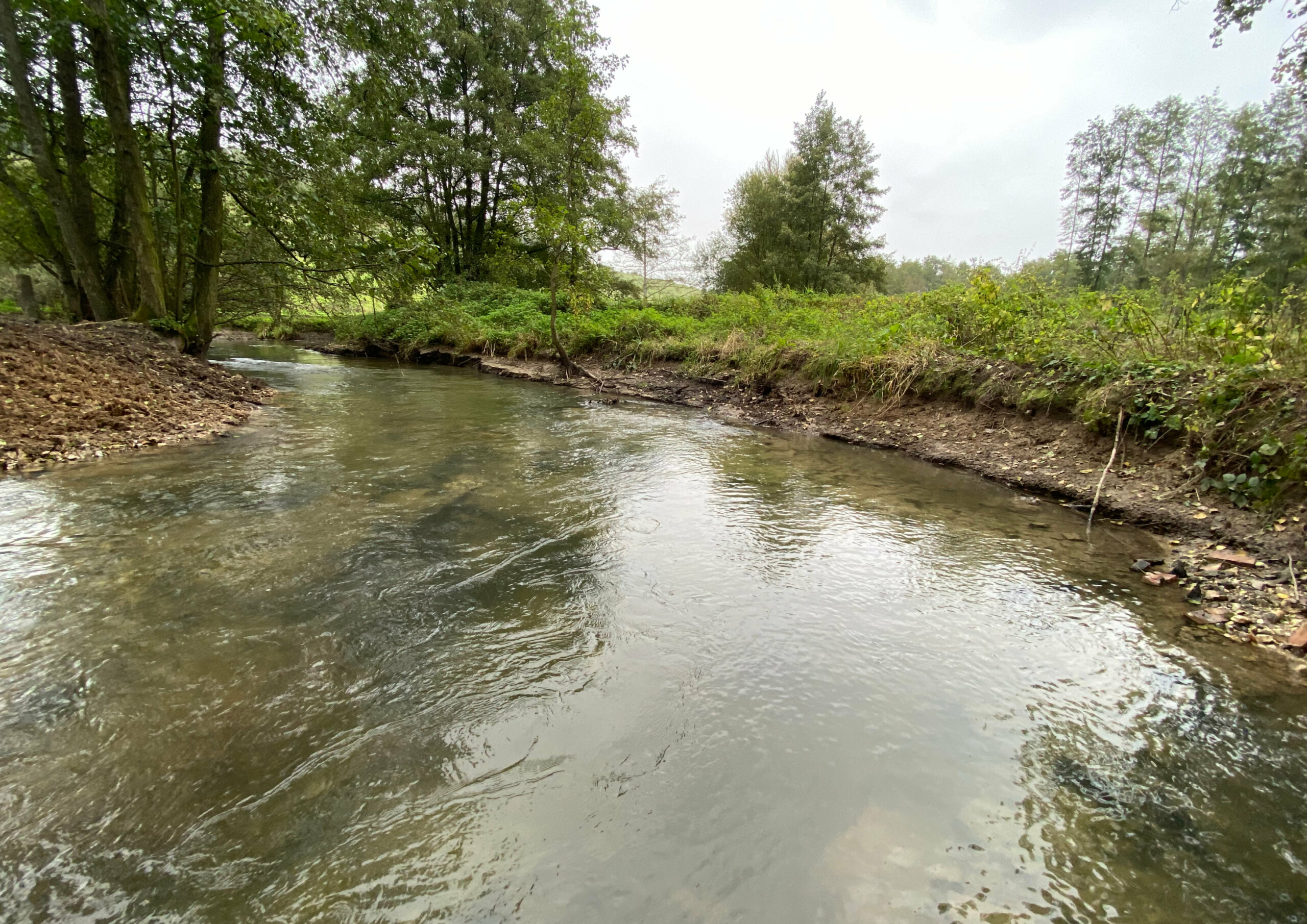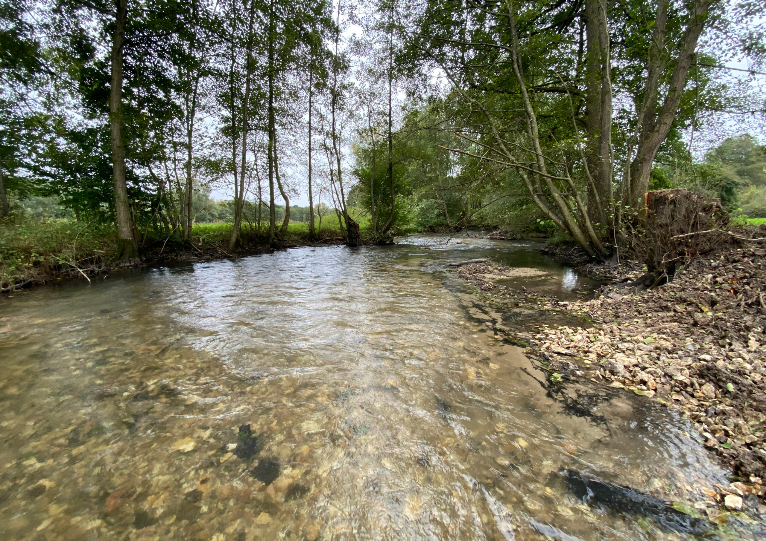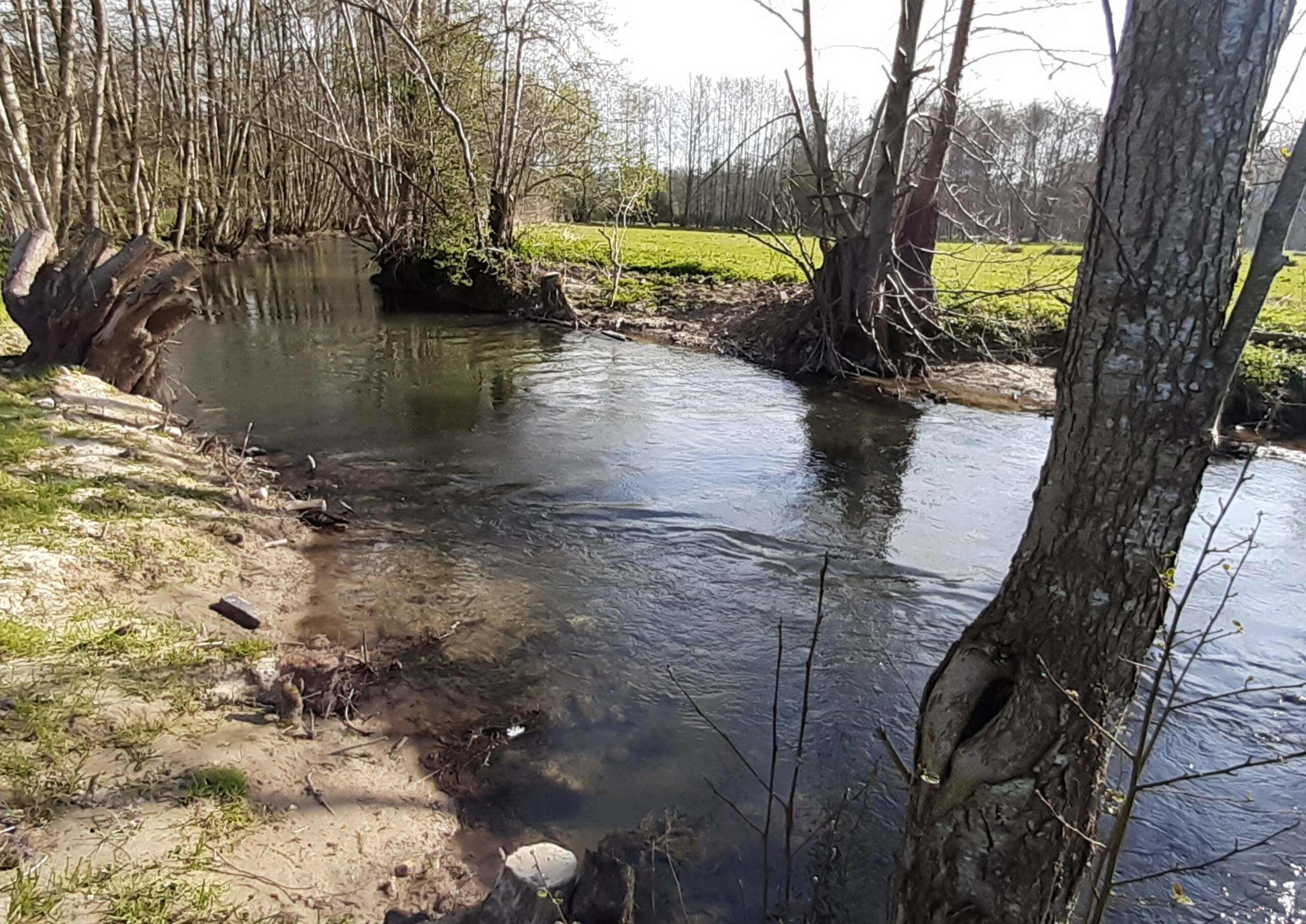 En aval (Eure) : cette portion du bassin, qui représente la moitié du linéaire de la rivière, retrouve un lit plus diversifié, avec des écoulements variés et un substrat grossier favorable au développement des salmonidés. Plusieurs zones de reproduction fonctionnent encore, offrant un meilleur potentiel d’accueil pour la truite. Cependant, ce potentiel reste limité par la densité d’ouvrages hydrauliques, qui fragmentent les habitats et entravent la circulation des poissons.