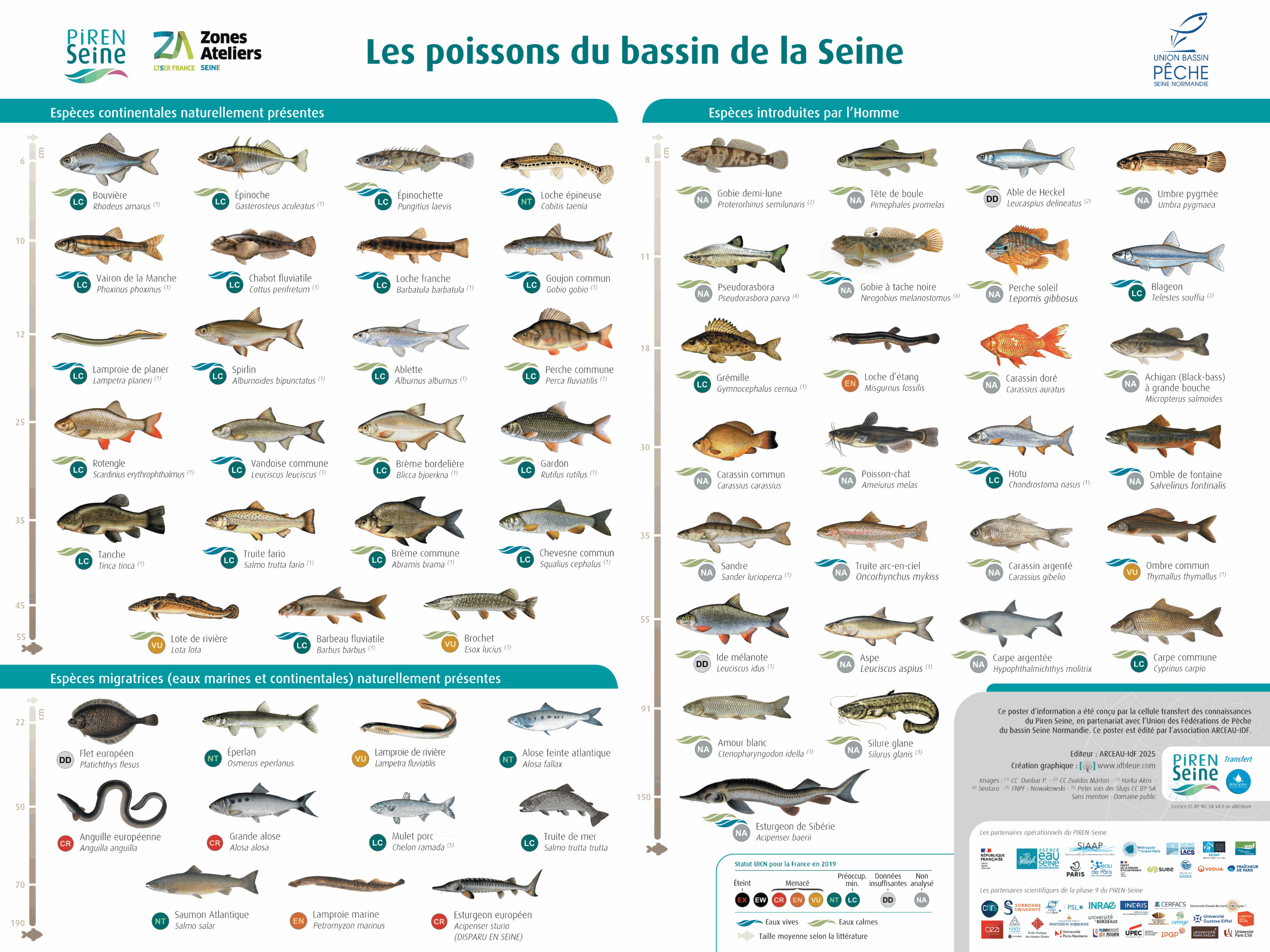 Les espèces de poissons présentes dans le bassin Seine Normandie et leur statut de conservation, selon la Liste rouge des poissons d’eau douce de France métropolitaine (UICN, juillet 2019).