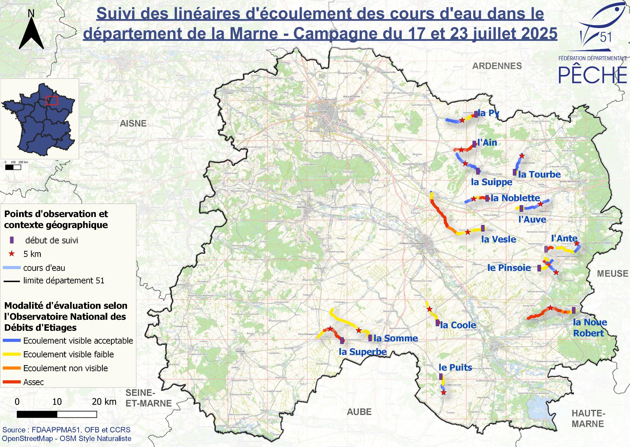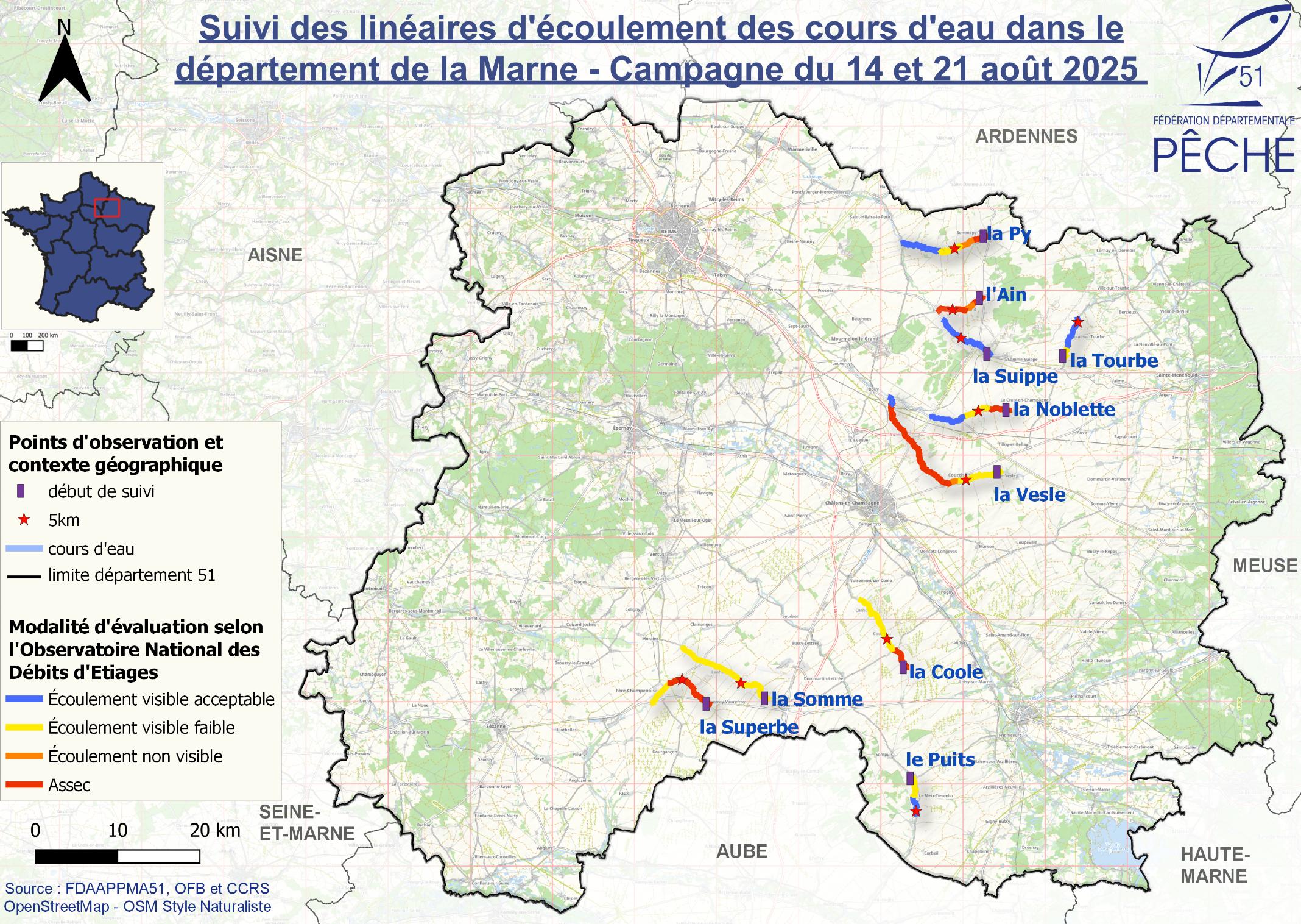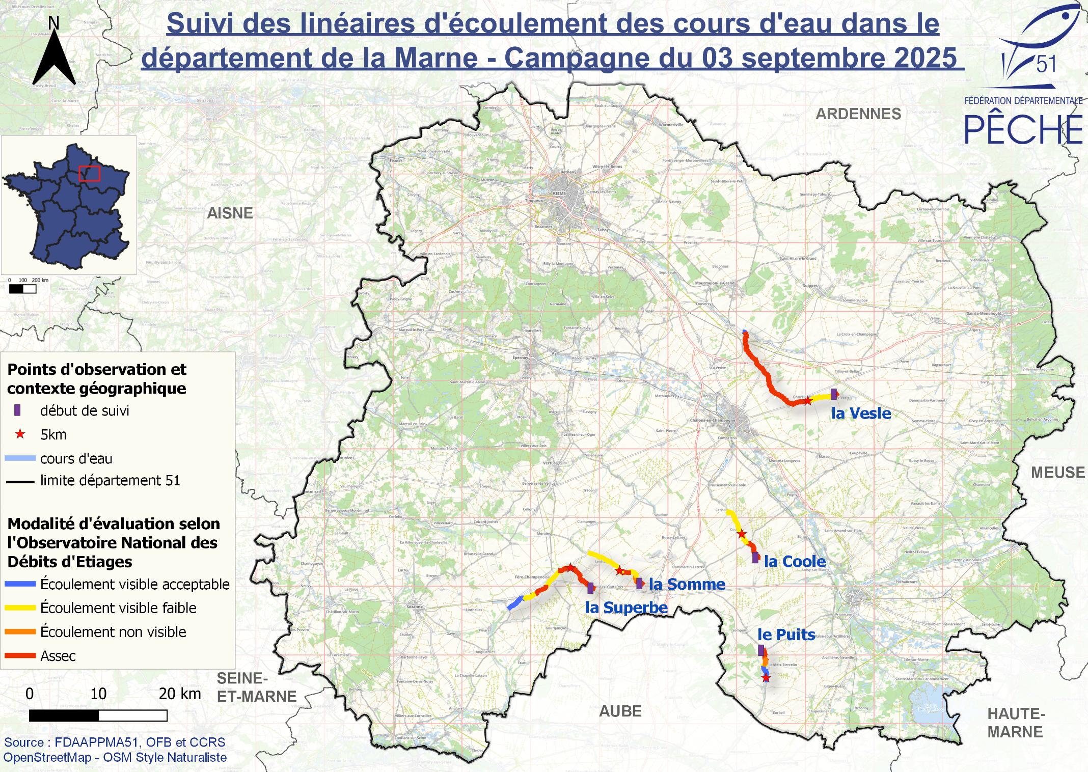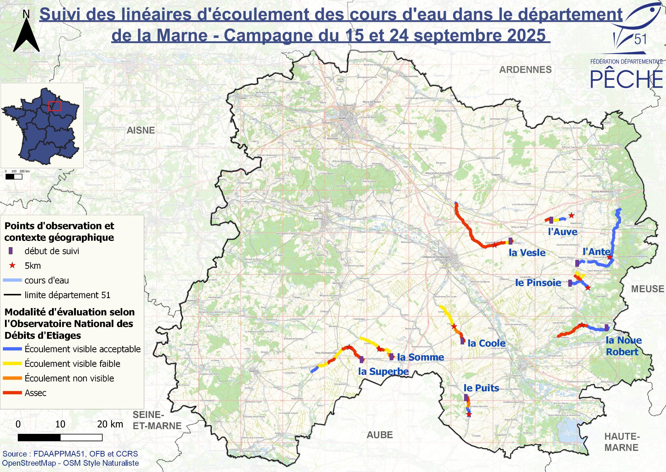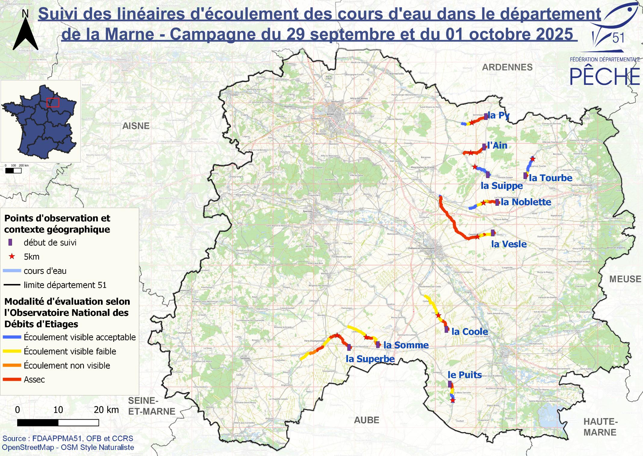Le suivi des linéaires d’écoulement mené par la Fédération de pêche de la Marne a été réalisé tous les 15 jours (± 3 jours) entre le 15 juin et le 1ᵉʳ octobre 2025. En parallèle, l’OFB et la Communauté de communes de la région de Suippe ont mené leurs observations une fois par mois, autour du 23 (± 3 jours). Conformément aux modalités du protocole ONDE, l’ensemble des linéaires de cours d’eau a été évalué sur des points stratégiques préalablement définis.