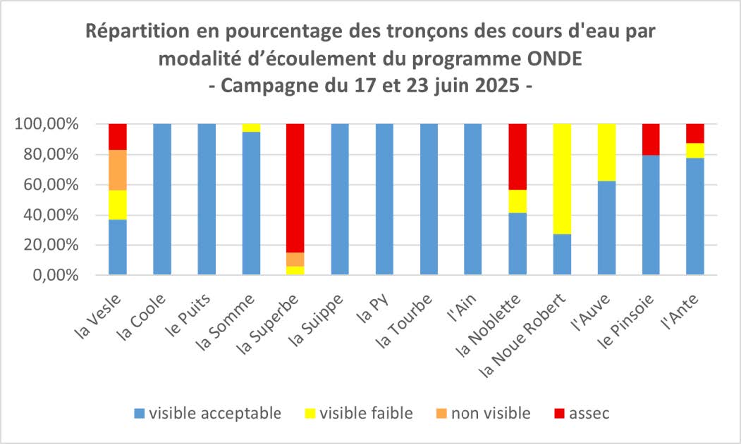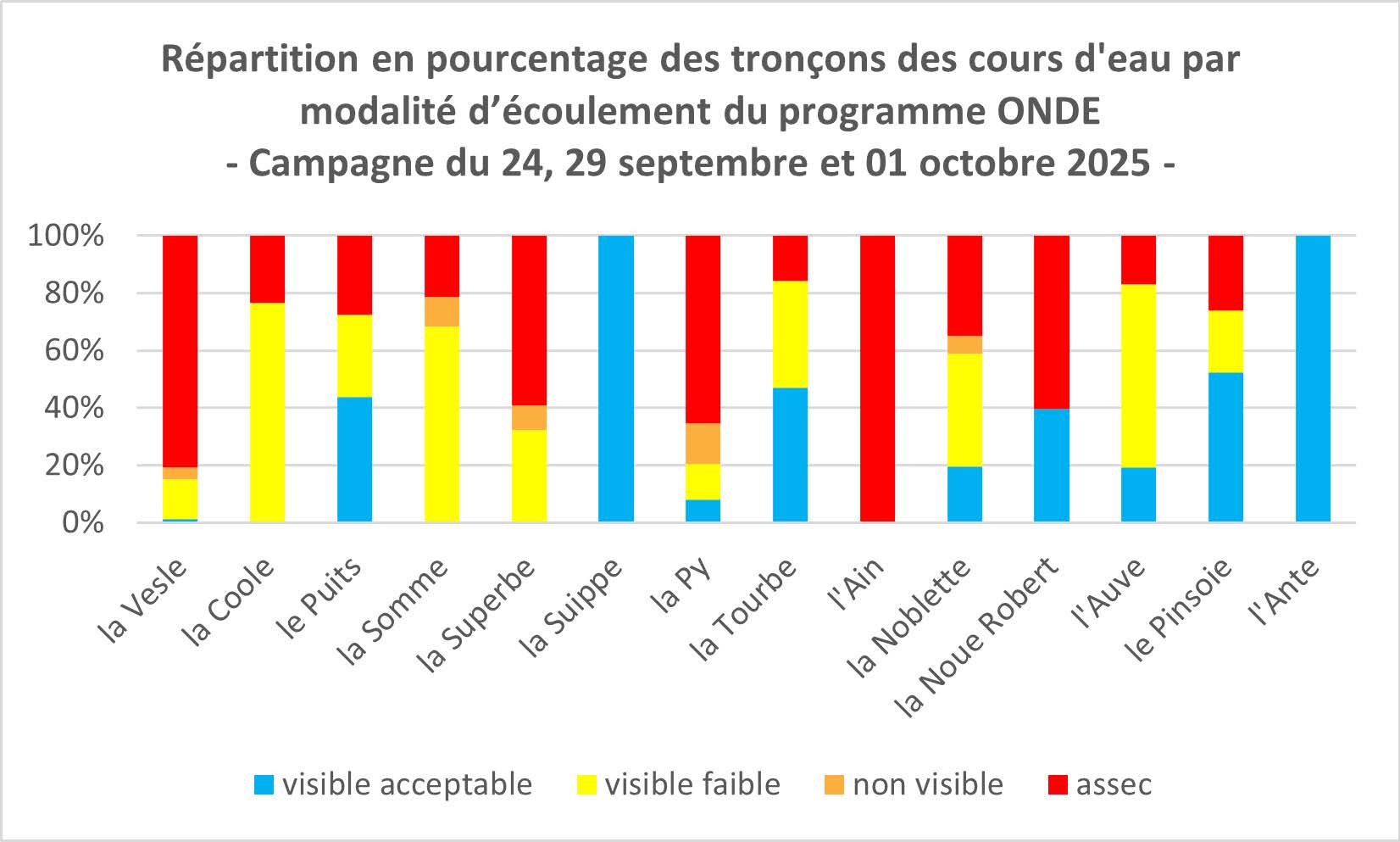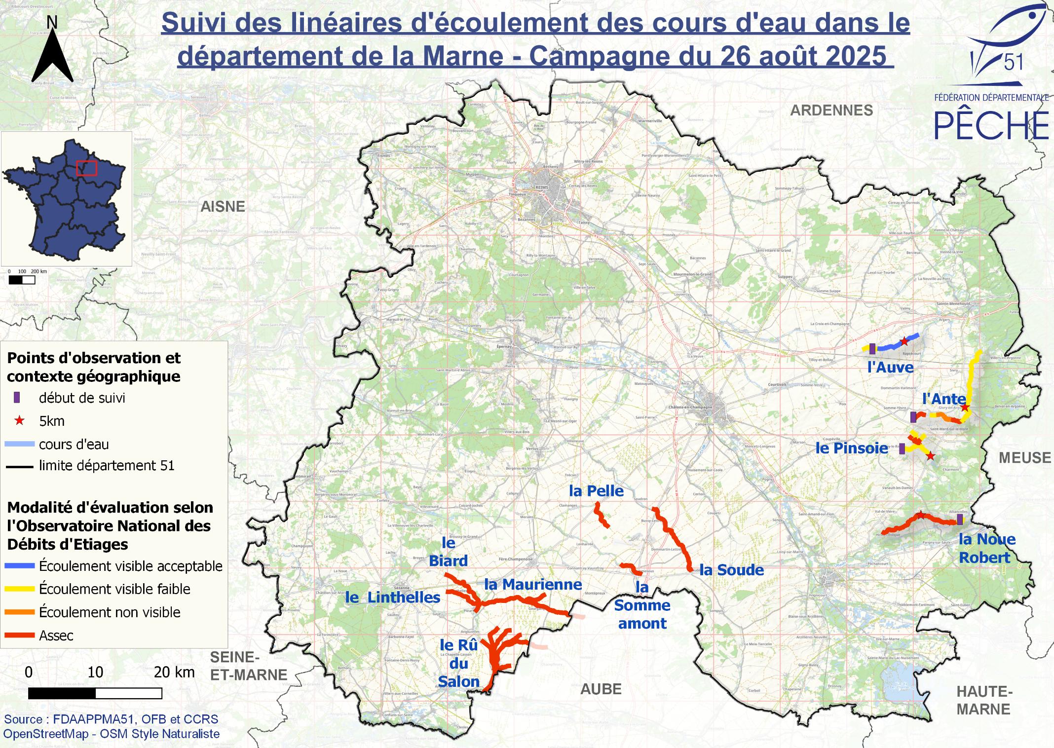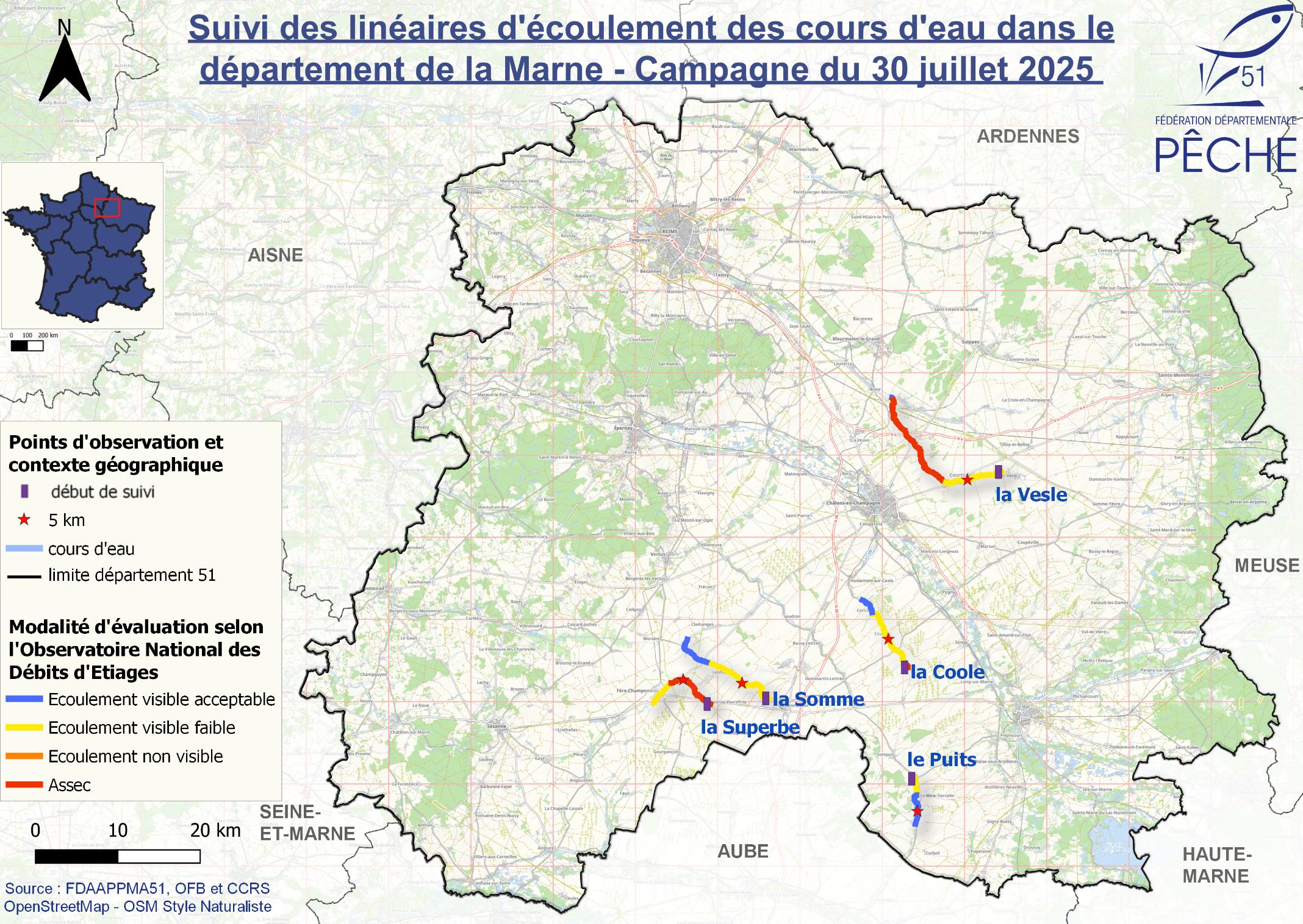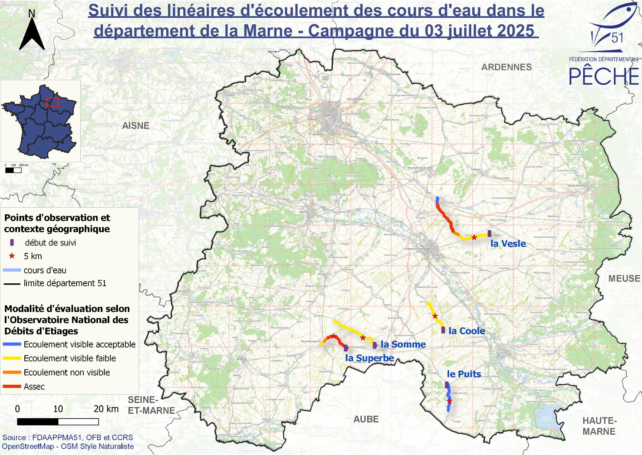 Le suivi des linéaires d’écoulement mené par la Fédération de pêche de la Marne a été réalisé tous les 15 jours (± 3 jours) entre le 15 juin et le 1ᵉʳ octobre 2025. En parallèle, l’OFB et la Communauté de communes de la région de Suippe ont mené leurs observations une fois par mois, autour du 23 (± 3 jours). Conformément aux modalités du protocole ONDE, l’ensemble des linéaires de cours d’eau a été évalué sur des points stratégiques préalablement définis.