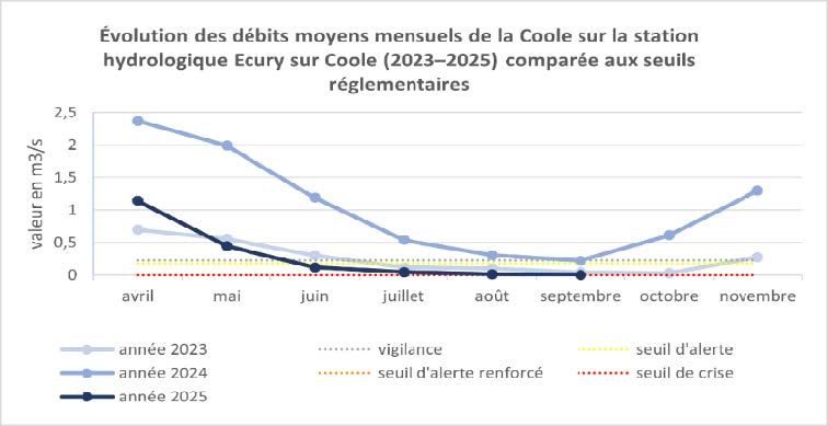 Les stations hydrologiques installées sur les cours d’eau ont permis de suivre l’évolution de leurs débits. Entre 2023 et 2025, une forte dégradation des débits a été observée sur la Coole. En 2023, les débits sont passés sous les seuils d’alerte durant l’été. En 2024, ils se sont maintenus tout juste au-dessus des seuils réglementaires. En 2025, la situation s’est nettement aggravée. La baisse du débit, amorcée dès avril, a conduit à franchir le seuil de crise en juin. Les débits sont ensuite restés quasi nuls jusqu’en septembre.