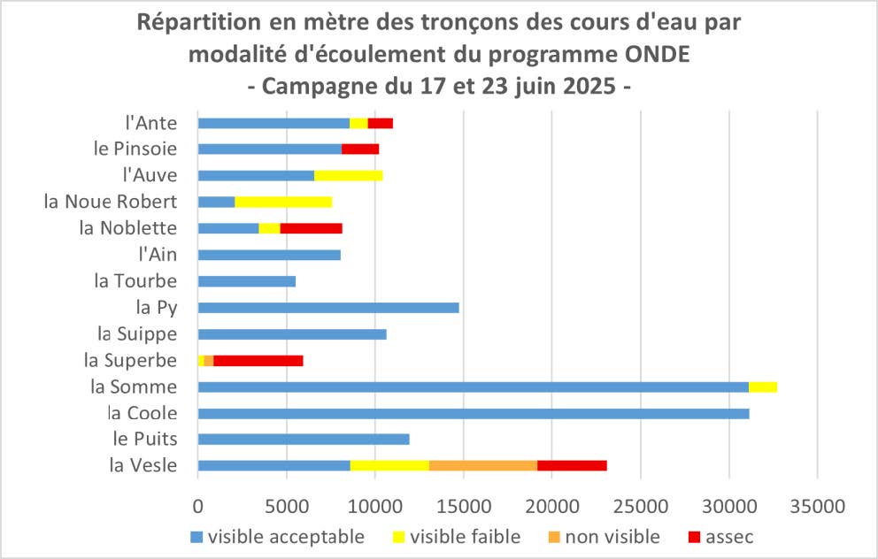 Sur 175,18 km de cours d’eau observés, 98,08 km (56 %) présentaient encore des écoulements visibles (acceptables ou faibles), tandis que 77,08 km (44%) correspondaient à des linéaires non visibles ou en assec.