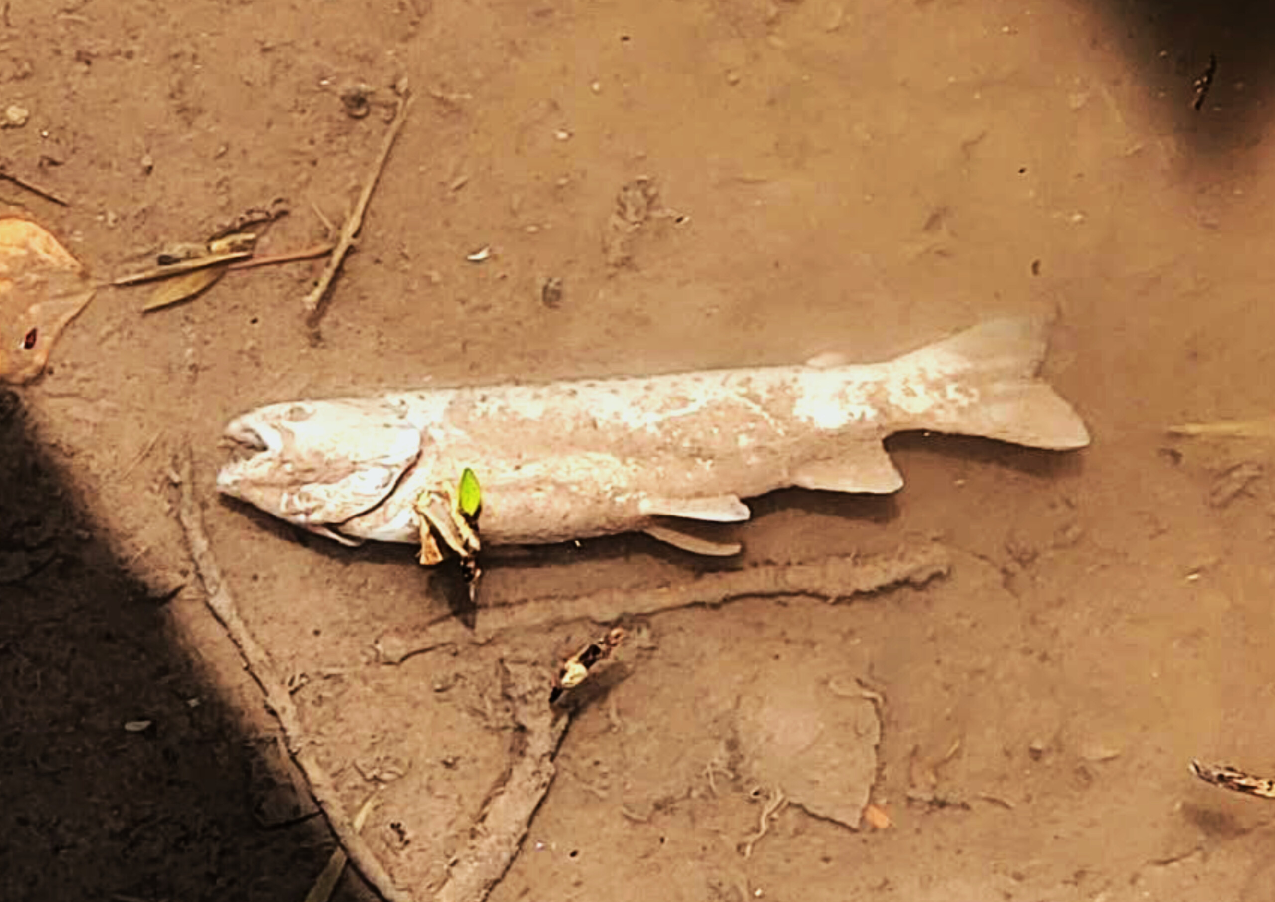 Photographie d’une truite fario morte à cause d’un assec, prise le 14/06/2025 à 17 km de la source de la Vesle